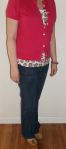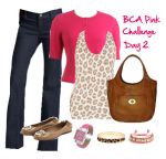 I hope your week is going well so far…it’s day 2 and I’m feeling up to the challenge…I wonder if I’m going to be sick of pink by the end of October. Doubt it. Anyway, day 2 was inspired by the great Fall weather we’re having – high of 75 and sunny today so I broke out my old J.Crew fuschia short sleeve cardigan…I don’t wear this enough, now I have a good reason to dust it off. Although it’s Fall and the colors of the leaves are giving us a spectacular combination of gold, auburn and orange hues, I’ll have to put off wearing Fall colors until after October.