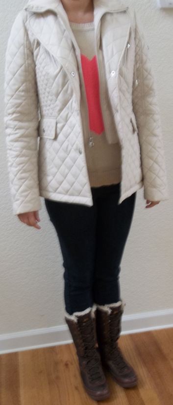 Back to more trivial matters (kidding!)…my OOTD was obviously dictated by the plunging temps. The pink heart sweater is another great find at F21; there are many incarnations of this sweater this year (J.Crew, Gap, Old Navy, etc.). It was the last one they had; thank goodness the small fit me. The fit is loose so size down if you happen to find it. The material tag lists 56% acrylic, 29% nylon/polyamide and 5% wool (wow..that’s precise); it’s very cozy, soft and cuddly, not flimsy or itchy at all, and it’s machine washable. The UGG snow boots were a bargain snag at a Saks Fifth Avenue outlet store – it was on sale with an additional 30% off – I’ve had it for a few years. It’s the only UGG boots I own – I’m not a fan of the Classic UGG boots; they look great on others but on me, it feels like I’ve morphed into an abominable snow woman. My quilted coat is Laundry by Shelli Segal from TJ Maxx. TJ Maxx has some really nice coat selections when the timing is right – at the beginning of the cold weather season so be sure to check it out.