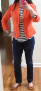 This morning when I was getting dressed, I decided to interject a vibrant orange color in my outfit. I was determined not to be a grumpy Gus despite my PC woes and a fun outfit always puts a smile on my face. The outfit was inspired by the pic below from Pinterest that I pinned awhile back. I just love the combination of the simple navy/cream stripe tee with the orange blazer. My blazer is actually from Forever 21 – I purchased it last year and I love love it. It’s made of a soft jersey knit material and fully lined with a stripe navy print. I find that the blazers from Forever 21 have improved dramatically. In fact, one of my favorite blazers is actually from Forever 21; it’s tweed with a fantastic fit (view similar here) for $34.99. I get compliments on it everytime I wear it and when I say it’s from F21, they’re almost always shocked.