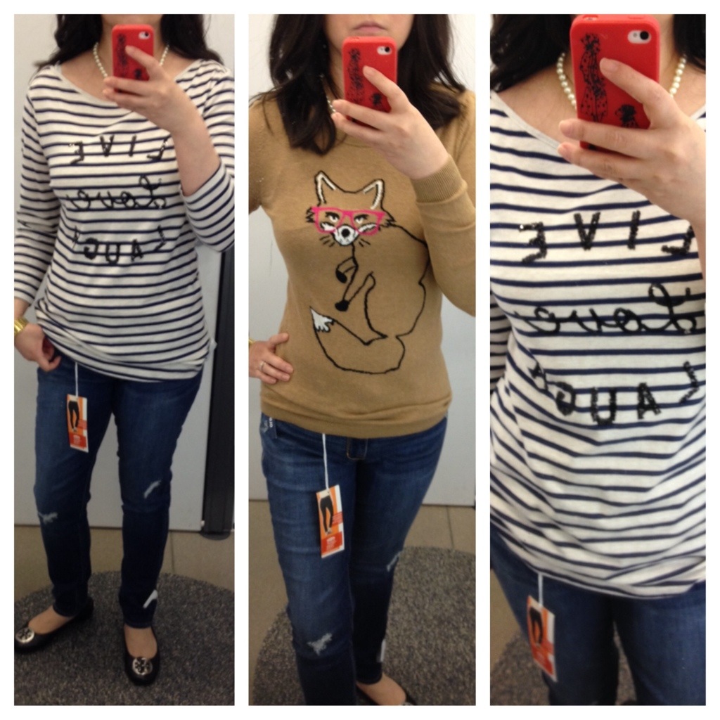 Most jeans $19 and all tops are buy one get one half off (even sale items, excludes clearance) thru today (9/21) only. Love the distressed Rock Star jeans…so comfy with the mid-rise and nice hem length. The prices noted are WITHOUT the BOGO half off deal. Plus if you have the 15% off coupon recd in the mail, you can use it on top of sale…woohoo!