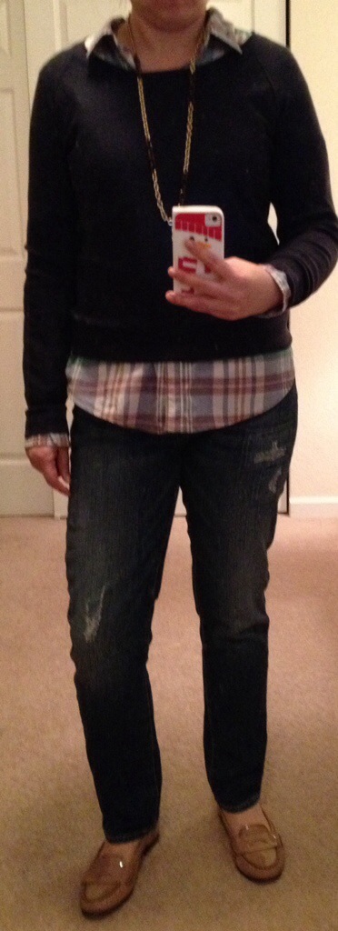 Quite cold today just as forecasted which means layers. Opted for navy J.Crew merino sweater purchased about 4 years ago with a F21 plaid button down. The Paige Skyline skinny jeans were a bargain find at Nordstrom Rack for $52, originally $210…I love these jeans, the fit is amazing! Because of the dumping we got, wore my snow boots then switched to loafers at the office. I’m having fun with this challenge but I’m only on Day 4 and the next time I go Christmas shopping, I’ll have to be disciplined about not buying anything for myself. That’s it for now!