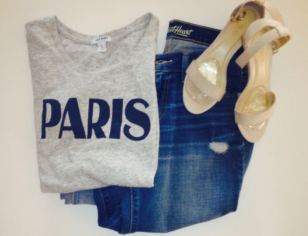 Anyway – first up is no shocker, Old Navy. I do love Old Navy for dups and basics; for the price, the quality is worth it IMO. I have some Old Navy pieces that are about as old as my Boo and Lulu, that’s at least a decade old. I actually went to Old Navy over the weekend and found these three items on sale; I’ve been holding out on the sueded wedge just because my normal size 6 is a little big on me but with a foot insert, it fits great and you can’t beat the price ($8.49 to be exact in store). The sweetheart distressed jeans was unbelievably priced at $4.99 in their clearance section – I’ve never tried this cut before…me likey :)…the high waist is flattering for my mama pooch and has enough stretch for the comfy-ness I’m always looking for. Lastly, I’m a sucker for a graphic tee, add any French frou frou-ness and I’m in. This simple Paris print tee at $12 is yes, comfy and will be easy to style all year long.