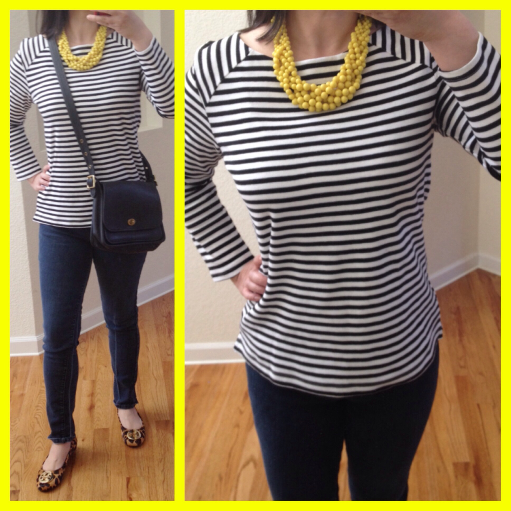 Wednesday 110514 – wearing stripe tee from Old Navy and necklace from Walmart…this necklace comes in so many colors and is only $5…love them!