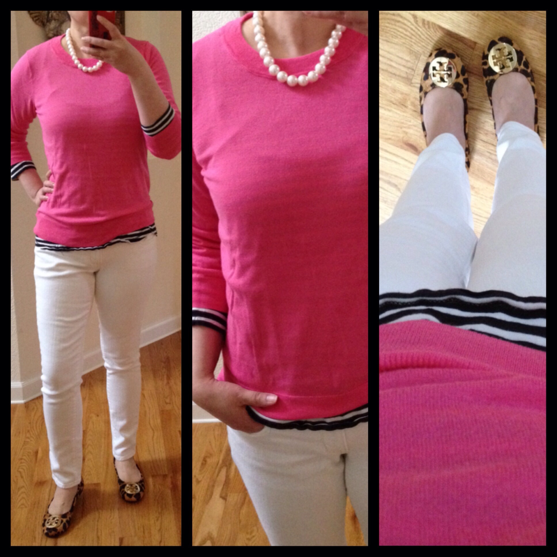 Friday 110714 – wearing old JCrew sweater and stripe tee..love the pop of pink with the black/white stripes + leopard flats.