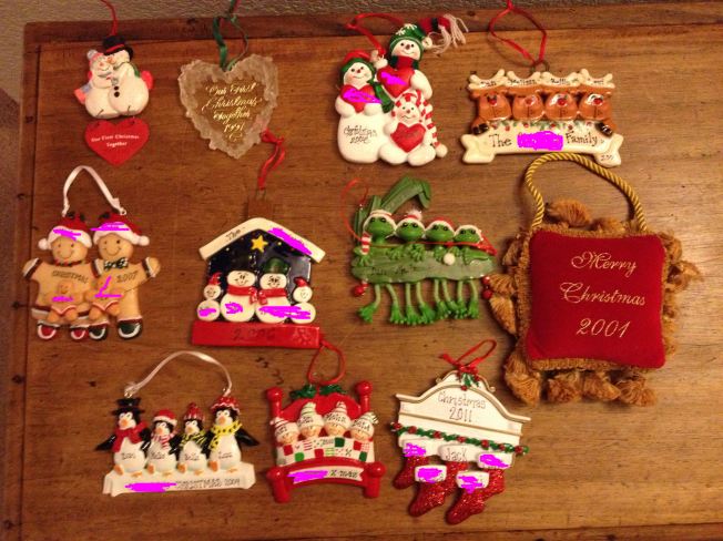 Since my husband and I were married in 1997, we have amassed quite a few…but not as much as I thought. Somehow, a few of the years were missing when we unwrapped the ornaments this past weekend to trim the tree. You can see from the photo above that there are only 10 pieces when there should be 15 (from 1997 to 2011), not including this year. I’m missing 1998, 1999, 2000, 2002, and 2005…bizarre. I know I got them but I can’t find them…I’m thinking they’re somewhere in my basement in a separate box (basement organization is one of my projects that I want to check off my list soon). I’ve been putting it off but I guess I’m buying more than one ornament this year to fill the gaps. Also, the 2001 ornament is a bit out of place…it was the year we had our first baby and I was too busy (and tired I’m sure) to actually go out get a proper ornament; the hanging door pillow was a gift from a co-worker. I think I’ll get a 2001 ornament to supplement the pillow.