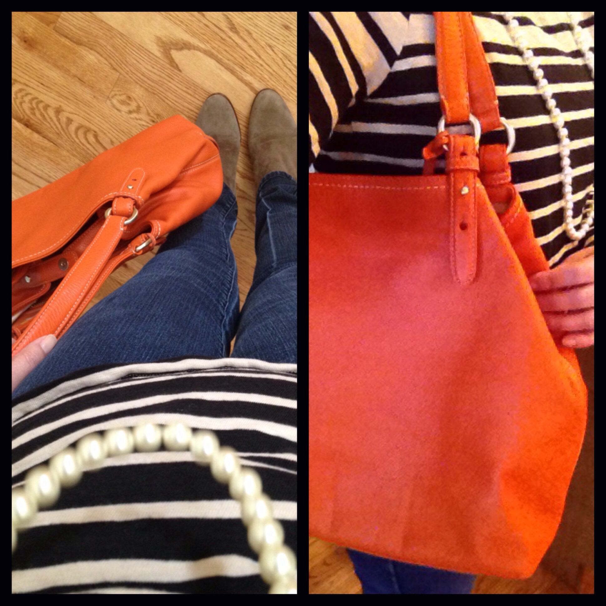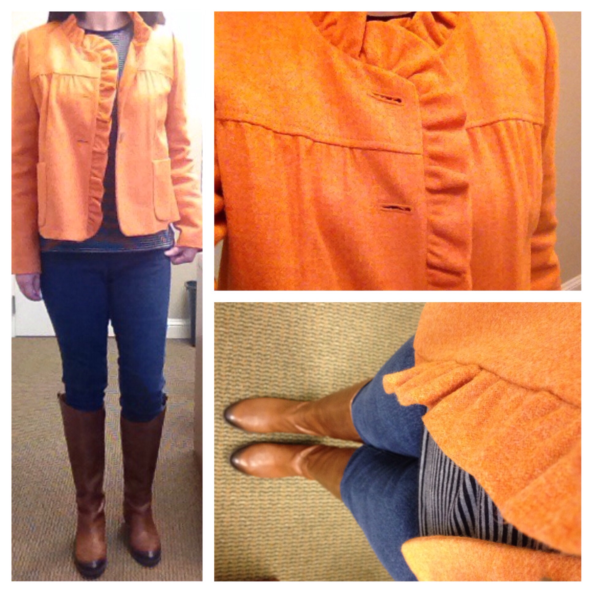Friday – switched purse to old orange Cole Haan for pop of Halloween color and here’s the second appearance of the Fiona jacket in cream boucle. I’m on the hunt for the camel version of this jacket.
