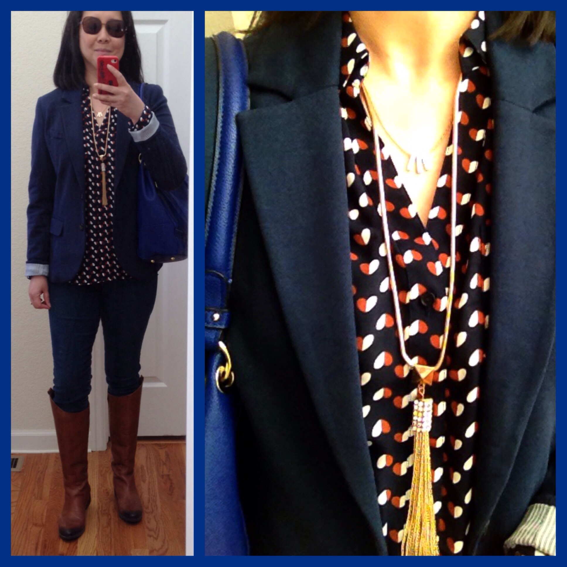Thursday – wore a favorite from latest The Limited purchase…the Ashton shirt in the heart print…love it with old F21 navy blazer and Sam Edelman boots. Also loving the cobalt blue Merona tote from Target, only $11 in store. Also comes in yellow, purple, etc.