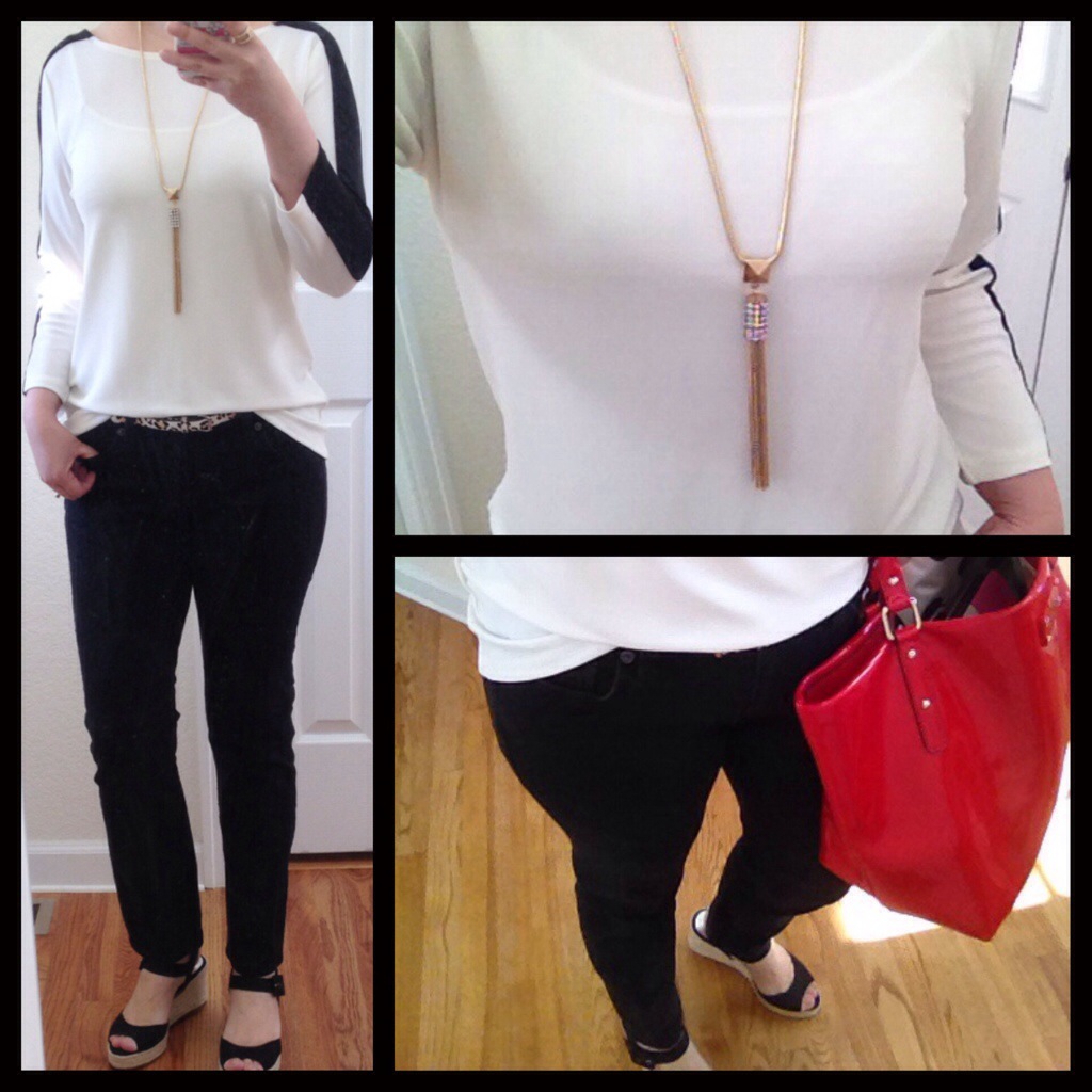 Lastly, I went to New York & Company hoping for a miracle that a necklace I regrettably didn’t pick up in another color (the one in various blue shades that I did pick up I’ve been wearing non-stop this summer, see here) is still there but no luck. What I did end up getting is the tassel piece…love it! It’s another classic that can enhance any top or outfit – so simple yet edgy.