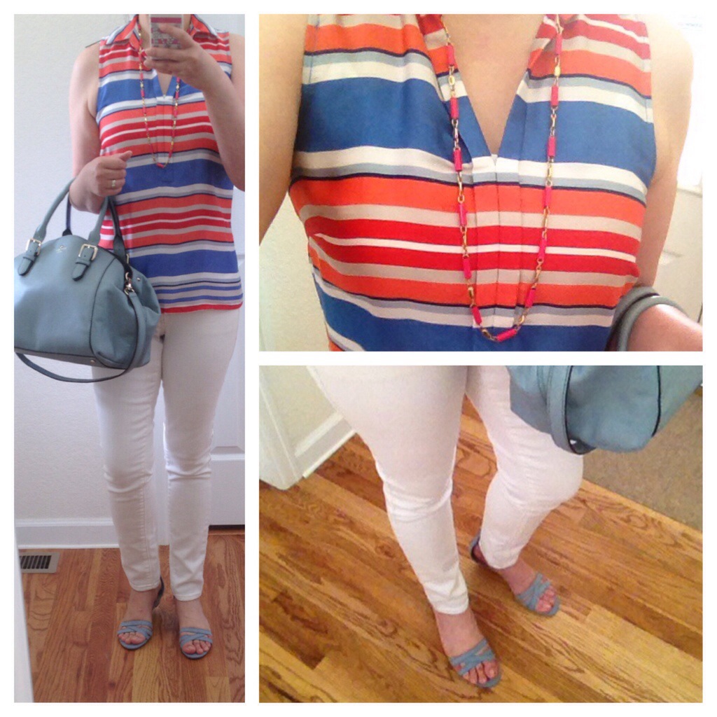Here’s an outfit look at the striped blouse from my recent Haul-A Monday purchase from The Limited. It’s such a fun blouse with vibrant stripes and flattering fit; especially with the solid knit in the back. I paired it with my summer staple of white Rock Star skinny jeans from Old Navy (the image above is showing a similar pair) and chambray flats from Target…perfect look for summer. The blouse was on sale at 50% off regular price when I purchased it. The Limited is having a sale now with 40% off your entire purchase…woohoo!