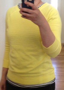 Yesterday was uncharacteristically gloomy for Colorado even during Winter; today was much better…sunny and not as cold so I decided to wear my bright yellow sweatshirt from Old Navy, purchased last Spring. Love layering this with a stripe tee that peeks out at the neckline and hip area. Top off with a navy blazer (mine is actually from Banana Republic from 3 years ago) and my French hen scarf from J.Crew…perfect casual attire.